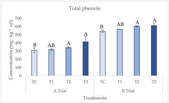 The content of total phenols (mg × kg−1 oil) for the inertization treatments, as described in Figure 1. Significant differences between the treatments (TC, T1, T2, and T3) are shown with different letters for p < 0.05 within each A and B trial (ANOVA Test).