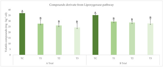 The content of volatile compounds (LOX derivative) (mg × kg−1) for the inertization treatments, as described in Figure 1. Significant differences between treatments (TC, T1, T2, and T3) are shown with different letters for p < 0.05 within each A and B trial (ANOVA Test).