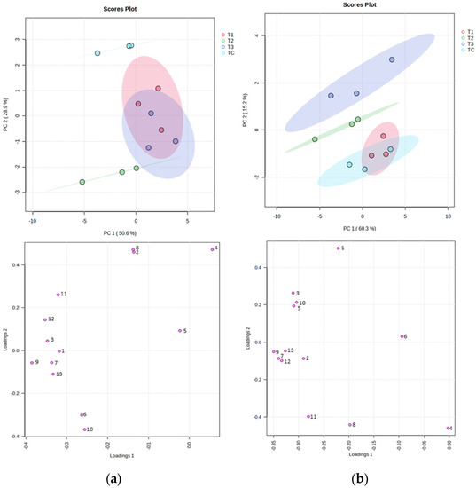 The Principal Compound Analysis (PCA) of the first two principal components (PC1 and PC2) in the treatments applied (TC, T1, T2, and T3) for trial A (a) and trial B (b). A group label corresponding to the volatile compounds classified and identified in Table S1 in 13 groups of compounds: 1. Furans, 2. No LOX aldehydes, 3. No LOX alcohols, 4. No LOX ketones, 5. No LOX esters, 6. Aromatic hydrocarbons, 7. Terpenes, 8. LOX aldehydes, 9. LOX alcohols, 10. LOX esters, 11. LOX hydrocarbons, 12. LOX Ketones, and 13. Unidentified.