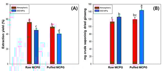 Extraction yield (A) and crude saponin content (B) of MCPG with HHP and puffing treatments. Different letters above the bars indicate significant differences (p < 0.05).