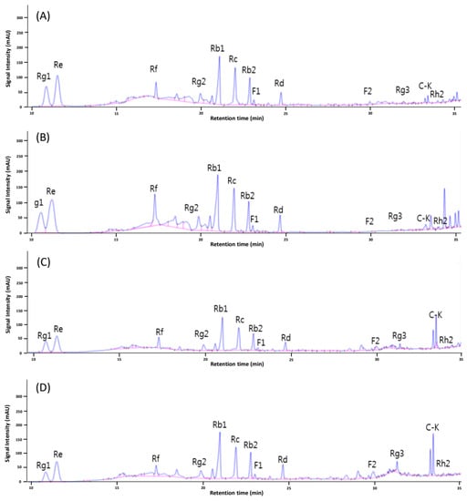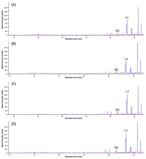 HPLC chromatograms of MCPG are shown in Figure 2 and Figure 3. Raw MCPG (control) showed higher levels of major ginsenosides such as Rg1, Rb1, and Rb2 and lower levels of minor ginsenosids such as Rg3 and compound K (Figure 2A). H-MCPG showed a similar tendency in HPLC chromatogram to the control (Figure 2B). In the case of acid-treated MCPG (A-MCPG), the content of major ginsenosides decreased, while minor ginsenosides such as Rg3 and compound K peaks slightly increased (Figure 2C). In the case of the combined treatments of HHP and acid treatments (HA-MCPG), its ginsenoside profile was similar to that of A-MCPG (Figure 2D). These results indicate that ginsenoside conversion in the nonthermal condition was not greatly affected by HHP treatment but was greatly influenced by acid treatment, and consequently, there is no synergistic effect between acid and HHP treatments. In contrast, the HPLC chromatogram of P-MCPG showed only minor ginsenoside peaks and almost no major ginsenoside peaks (Figure 3A). P-MCPG showed significant increases in the levels of Rg3 and compound K compared to the control. Puffed and acid-treated MCPG (PA-MCPG), PH-MCPG, and the combination of the three treatments (PHA-MCPG) resulted in similar ginsenoside profiles to that of P-MCPG (Figure 3B–D).