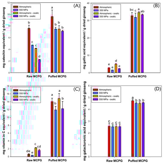 The ginsenoside content of MCPG according to each treatment is shown in Table 1. H-MCPG showed slightly higher ginsenoside content than the control, possibly due to the high amount of crude saponin, which likely came from the breakdown of cell walls and the increase in the mass transfer after HHP treatment []. In the case of A-MCPG, the content of major ginsenosides such as Rg1, Re, Rf, Rg2, Rb1, Rc, and Rb2 decreased, while the content of minor ginsenosides such as Rg3, Rh2, and compound K increased compared to those of the control and H-MCPG, possibly due to the acidic deglycosylation and conversion of major ginsenosides to minor ones [,]. HA-MCPG showed a similar ginsenoside profile to that of A-MCPG, suggesting that there was no synergistic effect from the addition of HHP to acid treatment. On the other hand, most of the major ginsenosides were not detected in P-MCPG; however, the content of minor ginsenosides such as Rg3 and compound K greatly increased, indicating that puffing treatment may cause a great ginsenoside conversion. There was no significant difference when HHP treatment was added, suggesting that HHP treatment did not show the synergistic effect seen in the combined treatments of acid and HHP. Unlike the addition of HHP treatment, acid treatment showed a synergistic effect with the puffing treatment. PA-MCPG showed a significantly higher content of ginsenoside Rg3 and compound K than P-MCPG; this result was probably due to the additional ginsenoside conversion of intermediate products produced by puffing. Major ginsenosides were known to be converted to ginsenoside Rg3 and compound K through several steps []. Thus, various intermediate products might be present after puffing. These intermediate products could be converted to ginsenoside Rg3 and compound K through additional acid treatment, which could result in a high ginsenoside Rg3 and compound K content. The ginsenoside profile of PHA-MCPG was not significantly different compared to that of PA-MCPG, implying no synergistic effect of HHP on ginsenoside conversion after puffing and acid treatments. The ginsenoside conversion was reported to improve with increasing puffing pressure []. However, there is a limitation in puffing because side effects such as carbonization occur at high pressure and temperature. Therefore, the combined treatment of puffing/acid treatments might be applied to the efficient processing of MCPG for higher ginsenoside conversion without carbonization.