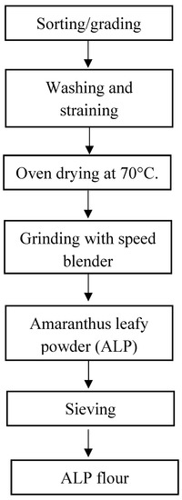 The Ujeqe ingredients for this study were purchased from Shoprite at Esikhawini Empangeni, South Africa. These ingredients include Golden Cloud white bread wheat flour, sunflower oil, Huletts white sugar, Gold Star instant yeast (finest quality), and iodized sea salt. All ingredients were stored separately in an airtight storage box in a refrigerator (4 °C) until they were used. Amaranthus dubius leaves were purchased from local vendors at the station market in Empangeni KwaZulu-Natal, South Africa. They were processed into Amaranthus leaf powder (ALP) according to the description in Figure 1.