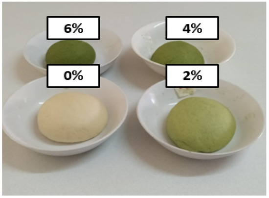 The addition of Amaranthus leaf powder (ALP) to wheat flour led to a change of color of the final dough (Figure 3) from light green to dull green. Additionally, it was observed that an increased concentration of ALP resulted in a lesser elasticity of the dough of the supplemented Ujeqe dough. The physical properties of ALP-supplemented Ujeqe are described below.