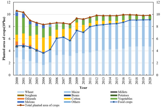 - The average sown area of wheat and maize during 2000–2020 accounted for 61.69% and 47.96% of the total sown area of crops, and increased at a rate of 3.42% and 5.93%, respectively. Therefore, wheat and maize are the main crops in Ningjin County, and their planted areas increased from 27.52% and 15.54% in 2000 to 47.82% and 44.75% in 2020, respectively.