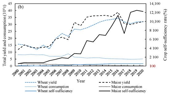 - The annual per capita yield of wheat and maize are 519.97 and 545.42 kg/cap throughout 2000–2020 respectively, indicating that the per capita grain yield is in a safe state. The self-sufficiency rate of maize showed a significant upward trend and reached 12604% at the peak in 2019, the self-sufficiency rate of wheat also showed an increasing trend, from 192.87% to 617.37%, which also indicates that wheat and maize can meet food self-sufficiency.