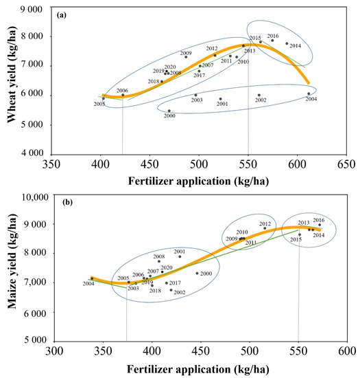 - Throughout 2000–2020, trends in fertilizer and wheat yield approximately showed an inverted “U” shape, and that of fertilizer and maize yield had an “S” shape, meaning that as fertilizer use increased, grain yield first rapidly increased before becoming essentially stable or decreasing. The results showed that 550 kg/ha is the threshold of fertilizer application, and exceeding this level will enter the stage of diminishing marginal returns. The national agricultural production and environmental protection policies, continuous improvement of crop varieties, as well as the farmers’ traditional practices have significant impacts on crop production.