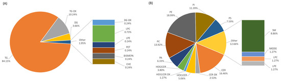 Qualitative lipid fingerprint of non-irradiated Camembert with the percentages related to the contribution of each lipid subclass. Lipids were identified in positive (A) and negative (B) acquisition modes.