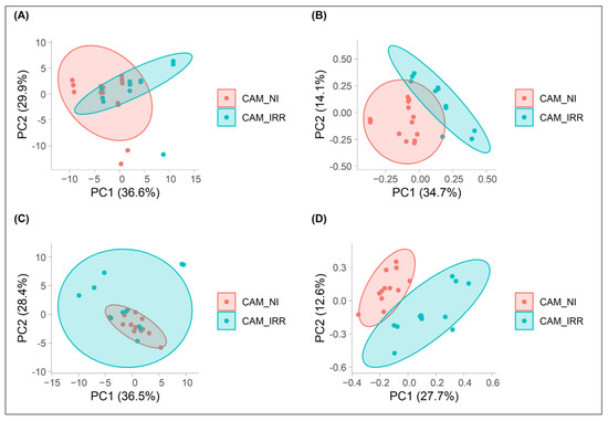 Score plots of PCA in negative (A) and positive (C) ion modes and PLS-DA in negative (B) and positive (D) ion modes of CAM_IRR and CAM_NI.