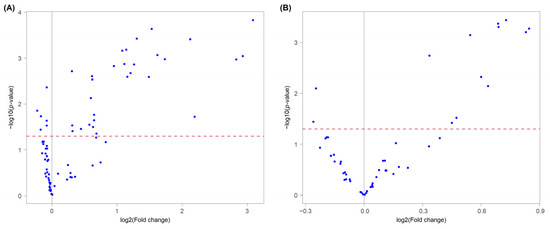 Volcano plot showing the most significant lipids by univariate analysis, identified in negative (A) and positive (B) ion modes.