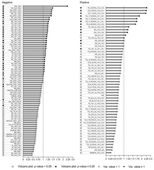 Partial least squares discriminant analysis (PLS-DA) is the most used classification method in metabolomics [34]. Firstly, the selection of the lipids as significant variables to use for the PLS-DA model was carried out through both the volcano plot and the VIP score. In the volcano plot, many lipids were clustered in a cloud below a threshold value in both the negative and positive datasets (Figure 3). These molecules did not produce significant differences in the ANOVA test (p > 0.05) between CAM_IRR and CAM_NI, with a deviation of their mean values close to zero.