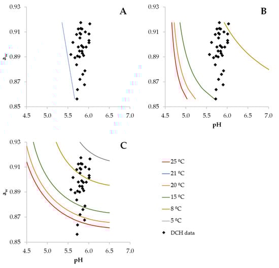 Distribution of pH and aw values of commercial dry-cured ham (DCH, diamond dots) and pH–aw boundaries for the growth probability of 10% for S. aureus at different temperatures according to the predictive models (lines) available in Borneman et al. [25] (A), Polese et al. [14] (B) and the Sym’Previus portal [26] (C).