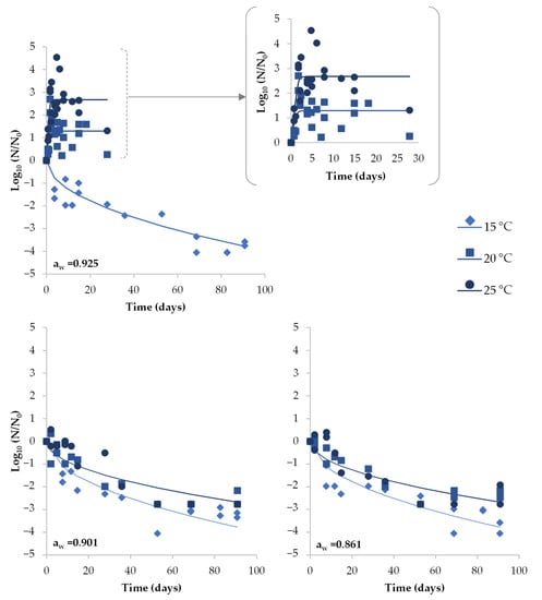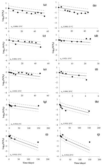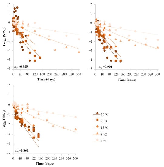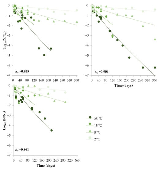 To evaluate the effect of storage temperature and DCH’s aw on the inactivation kinetics parameters (δ, p), a secondary model was developed based on a second-order polynomial equation (Equation (3)) for each packaging condition.