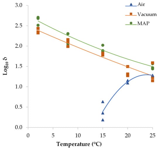 To describe the effect of storage temperature and aw on the inactivation kinetics of S. aureus through a polynomial model, different transformations of the parameters (δ and p) were assessed, and the Log10 transformation of δ values provided the best results. Table 2 gathers the coefficients of the polynomial model and Figure 5 shows the Log10 δ values as a function of temperature for the three different packaging conditions. Only the temperature, and not the aw, was found to significantly affect δ values in each packaging type. The effect of storage temperature on the time for the first Log10 reduction (δ values) in air-packaged DCH (δ decreased as temperature decreased) was the opposite of that in packaging systems without oxygen, i.e., vacuum packaging and MAP (δ decreased as temperature increased).
