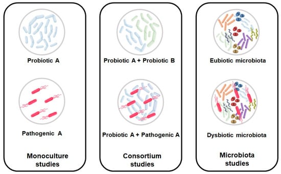 Some studies related to the gut microbiota focus on the impact that ingredients have on specific bacterial species such as Lactobacillus, Bifidobacterium, Faecalibacterium prausnitzii, Escherichia coli, and Salmonella spp. These studies usually start by assessing monocultures of specific bacteria and progress to mixing one monoculture with another bacterial monoculture (co-cultures) or with more bacterial species (consortium). These types of bacterial species-specific studies enable us to see the interactions between probiotics and pathogens or probiotics and probiotics within the substrate being tested. An example of a study that carried out this type of monoculture and bacterial consortium assay is the one developed by Carvalho et al. (2019), which studied the impact of insect flour on bacterial monocultures and a consortium of Lactobacillus and Bifidobacterium (two of the most important genera of gut bacteria for their probiotic activities), testing two different percentages, i.e., 1 and 10% of each monoculture [84].