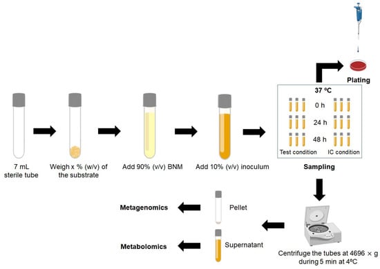 Briefly, sterile batch culture fermentation-independent tubes are set up and aseptically filled with sterile basal nutrient medium (BNM) [75] (in triplicates for each sampling time) with the pH adjusted to around 7 and gassed overnight with O2-free N2 inside of an anaerobiotic workstation at 37 °C. Each tube is inoculated with a specific inoculum (e.g., 10% (w/v) fecal inoculum diluted in 0.1 M phosphate-buffered saline (PBS)). The pH value is monitored at specific times (e.g., 0, 24 and 48 h). The batch tube cultures fermentations are performed under anaerobic conditions at 37 °C at a specific time (e.g., 48 h), during which samples for SCFA, branched chain fatty acid (BCFA), and lactate analysis are collected and analyzed through metabolomic techniques (e.g., HPLC) and bacterial enumeration is conducted by culture-dependent (e.g., plating) or culture-independent (e.g., qPCR) techniques [95]. After collecting the samples, a culture-dependent technique can be performed or the samples can be centrifuged, with the supernatant collected for metabolomic techniques and the pellet collected for metagenomic techniques (Figure 3).