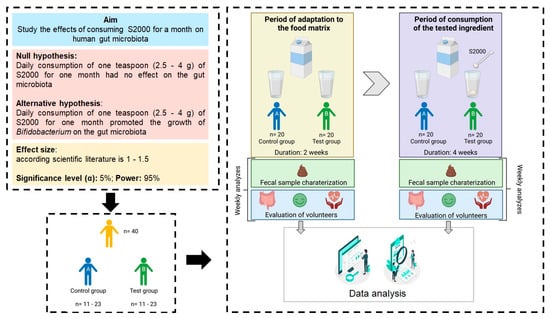 First, the experimental design states the aim of the experiment, the null and alternative hypotheses, and then the methodology foreseen is explicitly defined. The questions asked in the forms need to be structured in a way that participants can provide their personal information within the scope of the study and give their signed consent. Then, the effect size of trials is researched to define the significant level and power intended in the result analysis (Figure 5). The next step is to submit the work plan to the ethics and scientific council of the institution where the trials will be performed and then, only after the study’s approval, the volunteers’ recruitment can start. In the hypothetical scenario, in which only 40 volunteers were recruited, the effect size for the experiment is 1–1.5. By setting the α and power to 5 and 95%, respectively, and using the G*power software, each group should have 11 to 23 volunteers. Due to this number of volunteers (40), volunteers will be divided into two groups—(a) those who will not consume the testing ingredient (control group) and (b) those who will consume the testing ingredient (test group). To make the n of the two trial groups equal, it was determined that the control and test groups would have 20 volunteers each. The volunteers from each group will go through two different testing periods: (1) for the two first weeks (period of adaptation to the food matrix) both groups will consume the food matrix without the target functional ingredient and their stools will be analyzed weekly. Additionally, bowel habits, sleep, satiety, and vital signs, among other parameters, can be monitored. After that period, (2) the test group start to consume 1 teaspoon of the target ingredient (2.5–4 g) with milk daily and for four weeks (period of consumption of the tested ingredient) while the control group continues to consume milk without any added ingredient for the same period. The same analyses should be performed on a weekly basis to determine the differences between the two periods. The results obtained during the complete trial will be analyzed to determine whether, in fact, the daily consumption of milk with the target ingredient, over a month, had an effect on the volunteer’s gut microbiota (Figure 5).