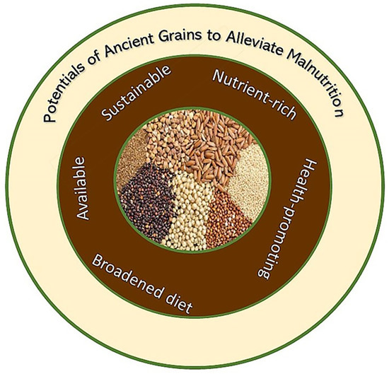 Ancient grains can have a great contribution in mitigating food hunger and malnutrition for several reasons, as discussed below (summarised in Figure 2).