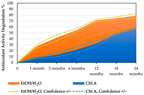 Monitoring antioxidant activity of EtOH/H2O vs. ChLA systems over 24 months (degradation). Dashed lines represent confidence intervals resulting from SD.