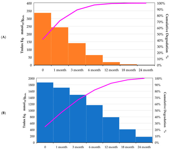 From Figure 1, it is possible to appreciate the degradation trends of the two different solvent systems. The sample in EtOH/H2O displayed a higher activity reduction, losing approx. 30% after only 1 month and approaching ca. 70% in 12 months. The final degradation nearly reached 79%. The ChLA system, on the other hand, showed a milder abatement of antioxidant activity across the monitored period, reaching around 57% of the final degradation. To better evaluate the activity variations, the Trolox eq. have been organised by means of Pareto charts (see Figure 2A,B), where the purple line describes the cumulative variation trend.