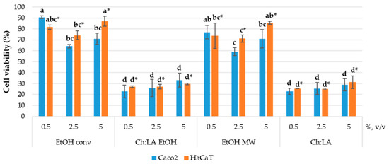 First, the antiproliferative activity of the extracts was investigated on the Caco-2 cell line. This cell line derives from human colorectal adenocarcinoma and is often used as a model for the epithelial barrier of the intestine. Therefore, it was selected to test the extracts obtained for their potential use as a dietary supplement and/or nutraceutical. The bioactive obtained from the VPP could also serve as natural antioxidants for cosmetic products, so the effect of the extracts on the HaCaT cell line was investigated. HaCaT cells are derived from healthy human keratinocytes, which represent 95% of the epidermal cells and primarily have structural and barrier functions in the human skin. The antiproliferative activity was determined by MTS assay. The results are presented in Figure 3.