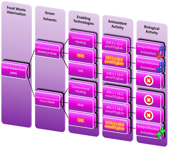 The present study aimed to investigate the potential recovery of polyphenols from Violet PPs waste using MW and US as enabling extraction technologies in combination with sustainable solvents. The NaDES chosen for this work is the ChLA, an equimolar mixture of ChCl and lactic acid (LA). The antioxidant activity of the VPPs extracts was evaluated using the DPPH· scavenging activity (2,2-diphenyl-1-picrylhydrazyl assay). The results have been compared with those of conventional extractions, and the shelf-life of both hydroalcoholic and NaDES-PPs extracts has been evaluated over a period of 24 months. Finally, the biological activity of the NaDES-PPs extract was investigated in terms of its antiproliferative activity adopting the so-called MTS assay, both on human tumour Caco-2 cells and human skin HaCaT cells.