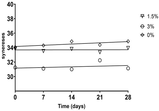 pH, syneresis, water-holding capacity, and instrumental color were evaluated every seven days during storage (0, 7, 14, 21, and 28).