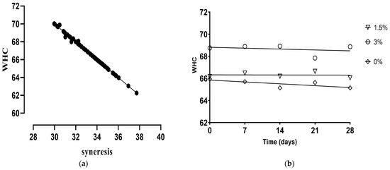 The results obtained for WHC confirmed the syneresis values and showed an inverse correlation between them, where syneresis was a strong predictor of WHC (Rv = 0.998; p < 0.0001; Table S1; Figure 3a), since the low water-holding capacity of proteins increases whey separation in fermented milk beverages [51]. In addition, the percentages of pulp and flour used were found to be positively correlated with WHC (Figure 3b). In addition, similar to syneresis, WHC was slightly altered, if at all, by storage time. This behavior is related to the different pH values that occurred during the storage period, since low pH values are among the causes that generate the release of whey in a product [52].