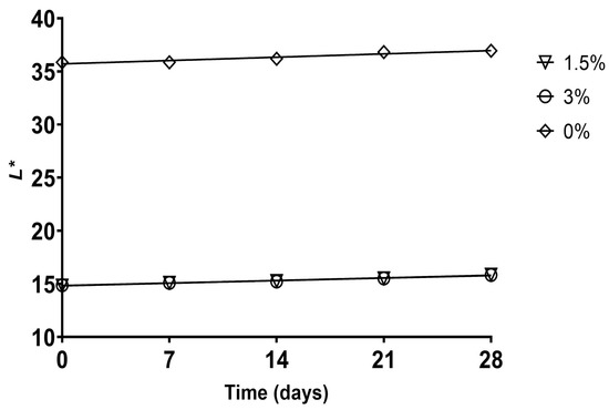 During storage, the L* values progressively increased in all samples during the 28 days, except for NPNF, whose values only increased until day 7 (p < 0.05). The reduction in the size of the casein micelles due to proteolysis during storage can increase L* values due to increased scattering light [53]. However, considering the treatments with added cupuassu pulp, the degradation of pigments during storage may have also contributed to this behavior [47].