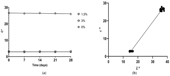 The instrumental color parameters of L* (lightness), a* (greenness–redness), b* (blueness–yellowness), C* (chroma), and h° (hue angle) of artisanal fermented milk drinks during the 28 days of storage are presented in Table 4. It is shown that adding pulp, in general, significantly reduced the L* parameter (p < 0.05), except on day 0, where there was no significant difference from the control. This fact may be attributed to the pigments present in pulp, which make the beverage darker [13]. Likewise, the L* values decreased more sharply in treatments with flour than in those with pulp. Thus, flour intensified the darkening when combined with pulp, as evidenced in LPHF (5% pulp and 3% flour), which exhibited the lowest value of this parameter (p < 0.05). Therefore, flour content was a strong predictor of L* (Rv = 0.867; Figure 4), which resulted from the dark pigmentation of the dust due to the oxidation of phenolic compounds in cupuassu seeds during technological processing [18].
