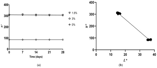 Chroma (C*), hue angle (h°), and total color difference (ΔE*) were calculated based on the analyzed color coordinates (Equations (1)–(3)). In addition, ΔE was calculated by matching the spectrum of the freshly prepared fermented milk beverage (day 0) and its relative spectrum on subsequent storage days according to Lucas et al. [32] as follows: