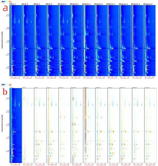 To compare the differences between samples, Figure 2b shows that a differential contrast method can be used. One spectrum from a sample is chosen as the reference sample, and other spectra are subtracted for comparison. If the volatile substances in the two samples are the same, the background after subtraction is white, with red representing higher concentrations than the reference sample, and blue representing lower concentrations. As shown in Figure 2b, when comparing sample YL-2 with reference sample YL-1 and other samples, the blue and red areas are significantly reduced, indicating that the volatile substances of YL-1 and YL-2 are similar in concentration, while there are significant differences in concentration between YL-1 and other samples. By establishing differential contrast maps for reference samples from different regions using GC-IMS, we can preliminarily discriminate and trace the koumiss from different regions.