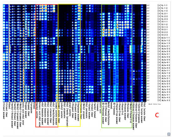 Additionally, Figure 2c presents the GC-IMS volatile organic compound fingerprint patterns of different samples, which were created by piecing together screenshots of each volatile organic compound from Figure 2a. Each row represents a sample, and each column represents a compound. By drawing the fingerprint patterns, we can clearly compare the volatile organic compound contents and changes in each region’s samples. In total, 35 volatile organic compounds were qualitatively determined. Based on Figure 3 and previous research results [], the results of volatile organic compounds identified by GC-IMS were considered insufficient. Although the results cannot fully demonstrate the flavor characteristics of koumiss from different regions, they can establish fingerprint patterns for grading and discrimination. By selecting the region outlined by the red box in Figure 2c, it can be observed that the concentrations of dimethyl sulfide, ethyl butyrate, ethyl hexanoate, ethyl octanoate, and 2-methylbutanal in the samples from the TC region decreased significantly with the change of the region. In the region outlined by the yellow box, the concentrations of isobutyl acetate, ethyl propanoate, 2-methylpropanoic acid ethyl ester, propyl acetate, and 1-propanol in the samples from the ALTe region were significantly higher than those in other regions. In the region outlined by the green box, the concentrations of trans-2-pentenal, methyl 2-methylbutyrate, hexanal, (E)-2-hexenal, 1-penten-3-ol, 1-penten-3-one, and acetone in the samples from the ALTw region were significantly higher than those in other regions.