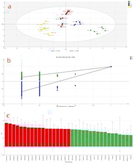 PLS-DA analysis of koumiss from different regions. (a) Score plot of PLS-DA; (b) Cross-validation results based on 200 permutation tests; (c) Ranking of volatile substances based on VIP scores. The red part is the substance with VIP value greater than 1. The green area is for substances with VIP finger less than 1.
