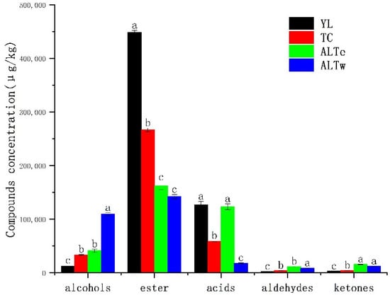Changes in the total content of alcohols, acids, esters, aldehydes, and ketones in koumiss from different regions. Letters a, b, and c indicate significant differences (p > 0.05) in the content of these compounds among different samples.