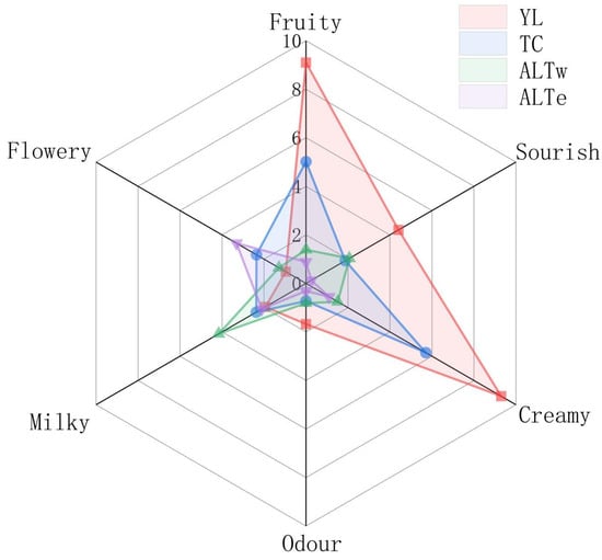 As the aroma components of koumiss samples measured by instruments cannot well explain the overall flavor of koumiss, and the aroma components contained in koumiss cannot explain their interactions, the human olfactory sensory system can provide comprehensive and sensitive feedback on the sensory characteristics of koumiss. Quantitative descriptive analysis (QDA) can obtain a complete sensory description of the sample, thus clearly showing the differences between samples []. To quantitatively describe the aroma of koumiss, it is crucial to develop sensory vocabulary with definitions and scales. Our sensory research team eventually determined the sensory evaluation vocabulary of fruit, cream, floral, odor, milk, and sourness. A radar chart was drawn based on the obtained sensory analysis data, as shown in Figure 6. For the attributes of fruit and cream, the scores of YL and TC regions were significantly higher than those of ALTe and ALTw regions, which were the main attributes of YL and TC regions. This may be due to the high content of ethyl caprylate and decanoic acid ethyl ester in YL and TC regions, consistent with the prediction of OVA values. The odor attribute had only a relatively high intensity in the YL region, which may be a manifestation of excessively high levels of Octanoic acid and n-decanoic acid. For the milky attribute, the ALTw region had the highest score, with an intensity of 4.2. The ALTe region had the highest score for the floral attribute, which was related to the content of phenylethanol. Interestingly, the sensory profile characteristics of koumiss in different regions are quite different. These phenomena indicate that the metabolic capacity of flavor substances produced in the fermentation process of koumiss differs due to different fermentation conditions and other factors, which provides a theoretical basis for establishing and differentiating koumiss fermentation techniques with specific sensory characteristics.