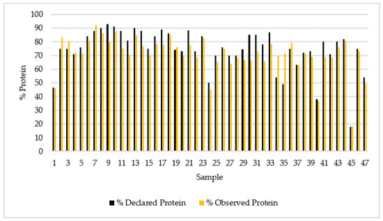 Protein percentage declared and observed in the 47 whey protein supplements.
