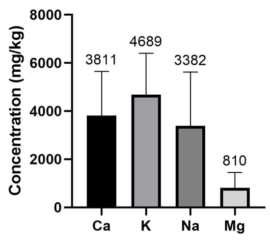 The results show that whey protein supplements are a source of minerals. In the case of Na, Mg, Ca, and K, the levels in these products are high, and protein supplements could be considered relevant dietary sources of these nutritional elements. While the mineral with the highest concentration is K (mean average concentration: 4689.10 mg/kg), the mineral with the lowest concentration is Mg (810 mg/kg) (Figure 2). Significant differences were detected between K vs. Ca (p = 0.0013), Ca vs. Mg (p < 0.0001), K vs. Na (p < 0.0001), K vs. Mg (p < 0.0001), and Na vs. Mg (p < 0.0001). However, no significant differences were detected between Ca vs. Na content (p = 0.0806).