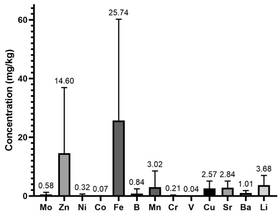 The microminerals that were quantified in the highest concentrations were Fe and Zn with concentrations of 25.74 and 14.60 mg/kg, respectively (Figure 3). Co, with levels of 0.07 mg/kg and V, with levels of 0.04 mg/kg, were the minerals with the lowest concentrations of this group of minerals. Significant differences were detected in the content of all trace elements, except for Mo vs. B (p = 0.1808), Ni vs. Cr (p = 0.9520), Co vs. V (p = 0.0873), and Ni vs. Cr (p = 0.9520). These differences may be due to the different ingredients and procedures that may have been applied by the manufacturers of these products.