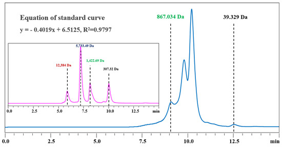 Gel filtration chromatography was utilized in this study to isolate and purify the component ERJ. We first identified the type of packing used for gel filtration chromatography by measuring the range of molecular weight distribution of ERJ. Figure 1 depicts the molecular weight peaks of the standards versus retention time, as well as the ERJ molecular weight distribution. The standard curve equation is fitted as y = −0.4019*x + 6.5125, R2 = 0.9797. The results demonstrated that the molecular weight distribution in the ERJ in the range of 39.329~867.034 Da accounted for 82.62% of the whole sample, and the molecular weight distribution was primarily concentrated below 1000 Da. Thus, Sephadex G-15 was chosen as the chromatographic column packing to achieve the separation of small molecule peptides.