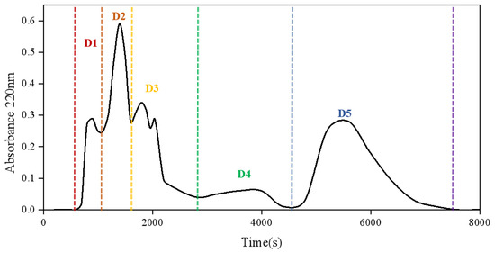 The enzymatic digest under the optimal process conditions was prepared as the sample for loading, and the loading concentration and volume were: 200 mg/mL, 1 mL. The five peaks were collected and named D1 to D5 (Figure 2). The separate elution peaks were collected, lyophilized, and compounded into a solution with a peptide concentration of 21 mg/mL, and the TYR inhibition rates of the different fractions varied widely. As shown in Table 2, the TYR inhibition rate of ERJ (D0) was 7.22%, while the inhibition rate of fraction D4 reached 82.89% which was significantly higher than the other fractions (p < 0.01). Therefore, fraction D4 was selected for further bioactive peptide identification.