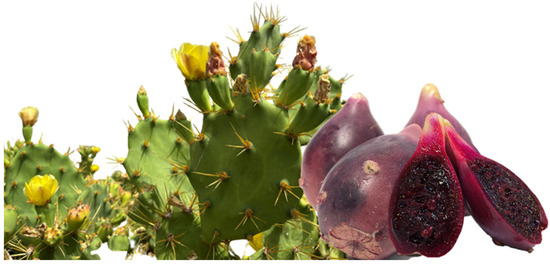 OPD’s fruits are a rich source of bioactive compounds such as betalains (responsible for their purple-coloured peel and pulp), especially betanin, isobetanin and neobetanin; phenolic acids, mainly piscidic acid, and flavonoids, principally quercetin and isorhamnetin glycosides [5]. These families of compounds have been recently studied and demonstrated potential in vitro antioxidant, anti-inflammatory, hypoglycaemic, immunomodulatory and anti-obesity properties, among others [6,7,8]. Some investigators have also studied benefits attributable to betalains and phenolic compounds from Opuntia ficus-indica in cell cultures, animal models and clinical trials [9,10].