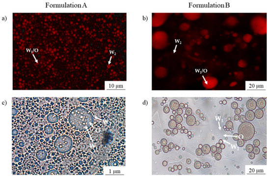 Optical microscopy was used to confirm that double emulsions were achieved in both formulations (A and B). Several drops of double emulsions were placed on a crystal slice and observed in the microscope. No dye was used to stain the samples. Optical microscopy was performed with a vertical microscope Axioskop (Carl Zeiss, Oberkochen, Germany) with Zeiss Plan-Neofluar lens (Carl Zeiss, Göttingen, Germany) coupled to a Leica DMC 6200 pixel-shift camera (Leica Microsystems, Wetzlar, Germany). The samples were observed with an open condenser and level four of illumination without colour filters. The samples were studied at 40× and at 100× with the addition of a drop of immersion oil to observe at 100×.