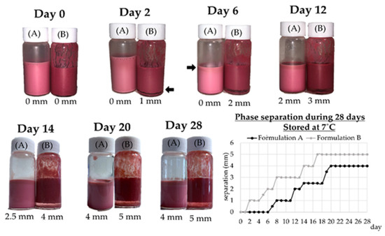 Instability phenomena lead to changes in the steadiness of double emulsions that could be seen by optical inspection such as gravitational separation or creaming analysis. Figure 4 shows the gravitational separation of both double emulsions (W1/O/W2), Formulations A and B, during 28 days of storage at 7 °C. Formulation A remained stable until Day 6, when creaming began. This creaming increased until Day 20, and then kept steady with 4 mm of separation between the two observed phases. Formulation B maintained the initial structure only within the first 2 days, and after this, the creaming enlarged. By Day 17 it achieved stability, with a phase separation of 5 mm. Regarding droplet size, Formulation B had larger droplets than formulation A, so this could be the reason for the sooner start of its creaming, although the zeta potential values suggested that Formulation B could be more stable. Walstra (2002) [29] reported that larger droplets cause faster creaming in the emulsion systems, and this observation coincides with the obtained results in this study. The incorporation of compounds that modify the formulation viscosities, such as Arabic and xanthan gums, delays the collision between droplets and could increase the stability of the double emulsion [36]. In our case, although Formulation B contained guar and Arabic gum, it turned unstable more rapidly.