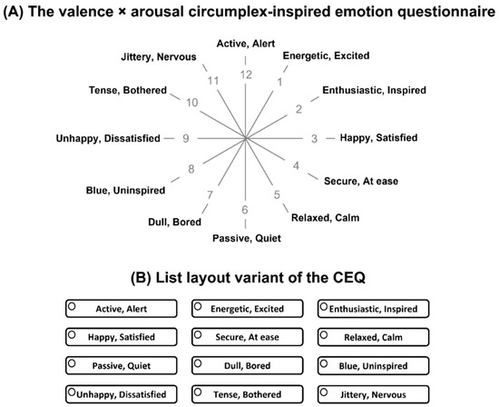 While the self-reported emotion questionnaire is a recommended tool for assessing food-evoked emotions [26,29,30,31], its formats have evolved over time to better conceptualize and time-efficiently capture emotional responses to foods. For example, several modified versions of existing emotion-related questionnaires, such as the EsSense Profile®, have been introduced [33,34], including the EsSense25 comprised of 25 emotion terms [33]. New types of self-reported emotion questionnaires have also been developed in recent years [35,36,37]. In 2020, Jaeger et al. [35] developed a single-response questionnaire inspired by a circumplex model of core affect, referred to as “the valence × arousal circumplex-inspired emotion questionnaire” (CEQ). The wheel-shaped questionnaire consists of 12 pairs of emotion terms (e.g., enthusiastic, inspired) that represent two dimensions, “valence” and “arousal”. As shown in Figure 1, it employs 12 axes that represent combinations of the two dimensions. Unlike the EsSense Profile® questionnaire, the CEQ has balanced numbers of pleasant (positive) and unpleasant (negative) emotion-related terms and includes both dimensions of valence and arousal. Another distinctive feature of the CEQ is its inclusion of 12 domains related to valence and arousal, and participants are asked to select which domain best represents how they feel and to circle the corresponding pair of emotion terms [35]. In their study using the CEQ, Jaeger et al. [38] tested whether emotional responses to 15 food names might differ as a function of question layout (i.e., circular vs. conventional list) and response format (i.e., single response vs. multiple response). The list layout of the emotion terms did not differ from the circular layout with respect to the frequency of citation for emotion terms, the percentage of significant pairwise sample comparisons, and the configurations of the two-dimensional biplots drawn by correspondence analyses. However, when multiple responses were allowed by using a Check-All-That-Apply (CATA) procedure, participants selected more than a single pair of emotion terms, thereby increasing the number of significant pairwise sample comparisons compared to when only a single response was allowed. In their follow-up studies, Jaeger et al. [39] also reported similar results, i.e., that the multiple-response format than the single-response format exhibited a better performance in discriminating test samples based on evoked emotions.