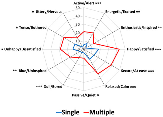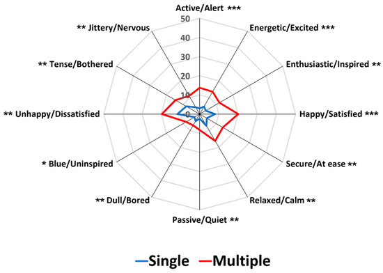 Comparisons between single and multiple response conditions with respect to mean frequency of citations per food image sample for each emotion term in Study 2. *, **, and *** represent a significant difference at p < 0.05, p < 0.01, and p < 0.001, respectively.