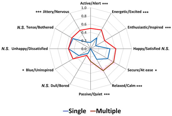 Comparisons between single and multiple response conditions with respect to the proportion of significant pairwise sample comparisons among the 91 possible comparisons across the 14 food image samples for each pair of emotion terms in Study 1. * and *** represent a significant difference at p < 0.05 and p < 0.001, respectively. N.S. represents no significant difference at p < 0.05.