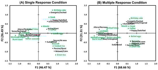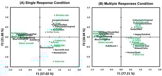 As shown in Figure 4, biplots of CAs represent associations between the 14 food image samples (green triangles) and the 12 pairs of emotion terms (black circles) for single (A) and multiple (B) response conditions, respectively. The biplots of the SR and MR conditions exhibited both similar and different patterns in terms of associations between food image samples and their evoked emotions. More specifically, while the total variances of the associations between food image samples and evoked emotions were mainly explained by the X-axis (F1, “valence”-related) under both SR and MR conditions, the total variances accounted for by the X-axis in the MR condition (72.21%) were higher than those for the SR condition (57.02%). This result suggests that participants used the pairs of emotion terms related to the “valence” dimension more often than those related to the “arousal” dimension, which is in line with previous studies demonstrating that test samples were differentiated by emotional responses, mainly their positive/negative valence [59,60]. It is worth noting that while the food image samples located on the positive side of the X-axis (F1, “valence”-related) were separated over a wider range of the Y-axis (F2, “arousal”-related), those located on the negative side of the X-axis were distributed within a narrower range of the Y-axis. This result is in line with a previous study asserting that activation (arousal) can be the main discriminating factor in positive emotions [61]. On the other hand, since these observations also suggest that the food image samples used in this study did not elicit a wide range of arousal levels when rated with negative valence dimension, a further study using test samples with a wider range of arousal levels should be conducted to confirm the interpretation of this result.
