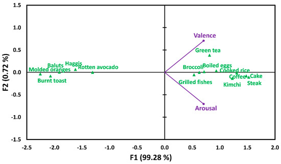 A biplot of the principal component analysis based on the mean ratings of valence and arousal for the 14 food image samples (green triangles).