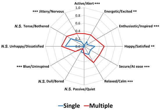 Comparisons between single and multiple response conditions with respect to the proportion of significant pairwise sample comparisons among the 91 possible comparisons across the 14 food image samples for each pair of emotion terms in Study 2. ** and *** represent a significant difference at p < 0.01 and p < 0.001, respectively. N.S. represents no significant difference at p < 0.05.